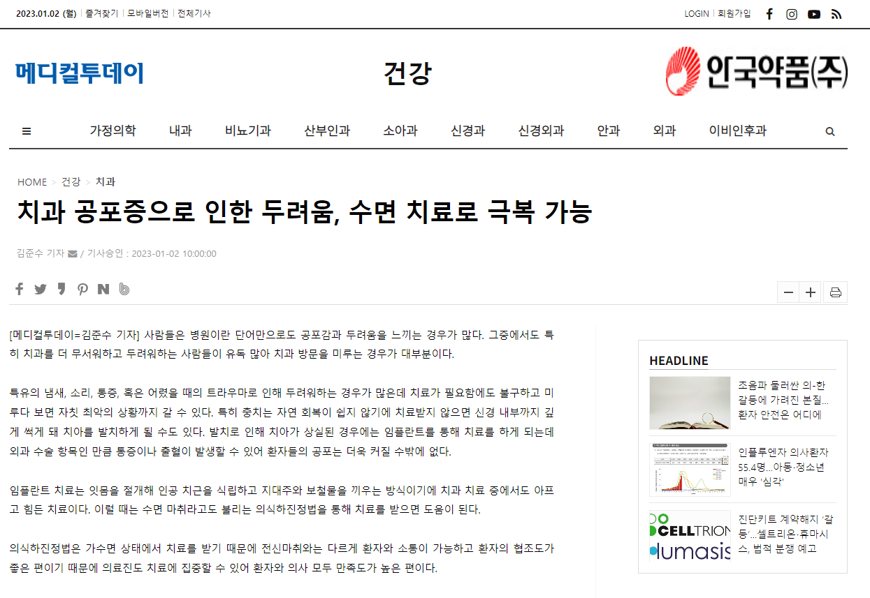 치과 공포증으로 인한 두려움, 수면 치료로 극복 가능 (메디컬투데이 언론보도)